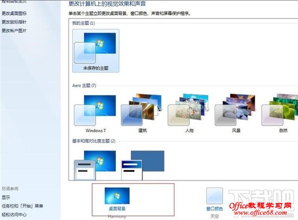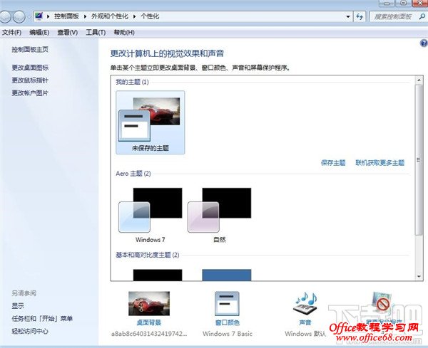 2、右键单击:个性化,进入控制面板的外观和个性化个性化设置可以选择Aero下的默认主题,也可以随机获取更多主题。