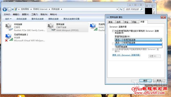 7、在网络连接里,右键单击已连接到Internet的网络连接,选择“属性”→“共享”,勾上“允许其他网络用户通过此计算机的Internet连接来连接(N)”并选择“无线W网络连接2”。确定之后,提供共享的网卡图标旁会出现“共享的”字样,表示“宽带连接”已共享至“无线W网络连接2”。