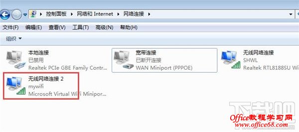 6、进入适配器设置就会发现多出了一个网卡为“Microsoft Virtual WiFi Miniport Adapter”的无线网络连接2。若没有,则尝试更新无线网卡驱动。