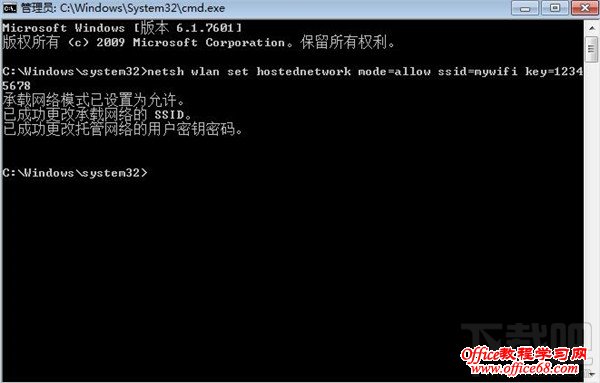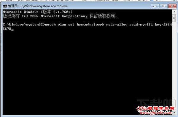 3、打开之后,输入命令:netsh wlan set hostednetwork mode=allow ssid=livdran2012 key=100100100 。 mode:是否启用虚拟WiFi网卡,改为disallow则为禁止。 ssid:无线网名称,可以随意设置,我这里以mywifi为例。 key:无线网密码,可以随意设置,我这里以12345678为例。