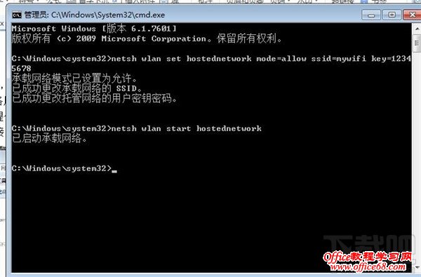 8、然后,继续在命令提示符中输入:netsh wlan start hostednetwork,按回车键运行。 最后,无线网络连接2的红叉消失,WiFi基站已组建好并启动,用支持WiFi的设备搜索到自己建立的无线网络(如例中mywifi),输入自己设置的密码(如例中12345678),即可共享上网了。