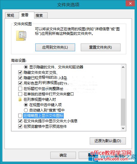 取消Win8缩略图方法 1.打开文件夹选项。 2.点击查看标签页。 3.取消勾选“在缩略图上显示文件图标”。 4.确定,保存。 |