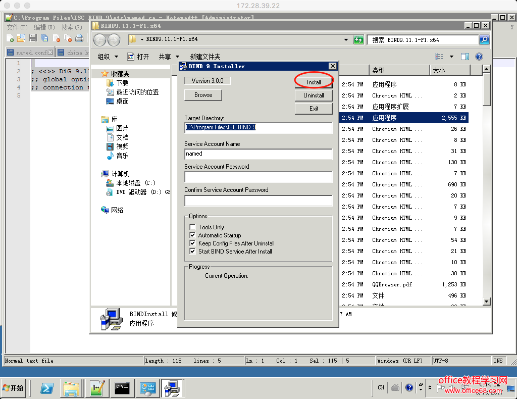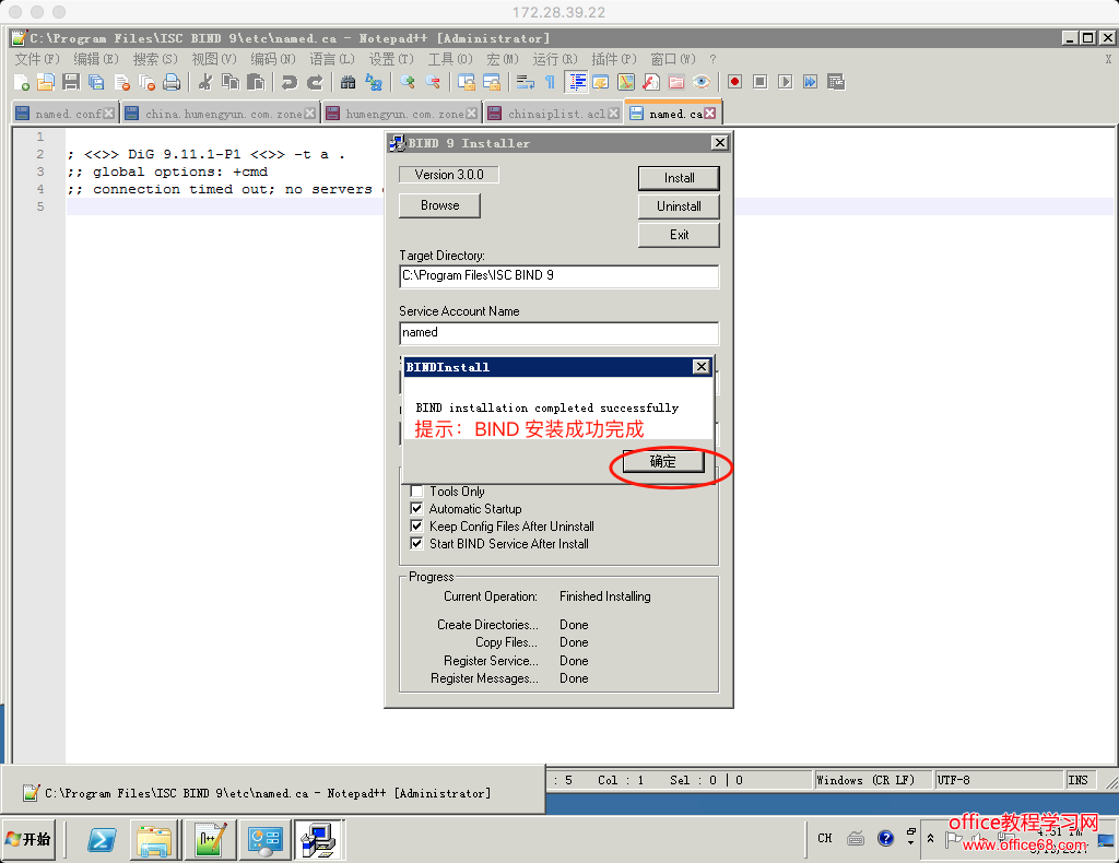 安装 将下载的BIND9.11.1-P1.x64.zip解压,进入到解压后的文件夹,运行BINDInstall.exe,在弹出的安装窗口中输入一个密码(这里我是输入是:123456),一直默认安装就行了,不需要更改什么设置。默认安装到C:\Program Files\ISC BIND 9 注意 不要勾选安装完成后开始服务,因为还没有配置 会提示错误!