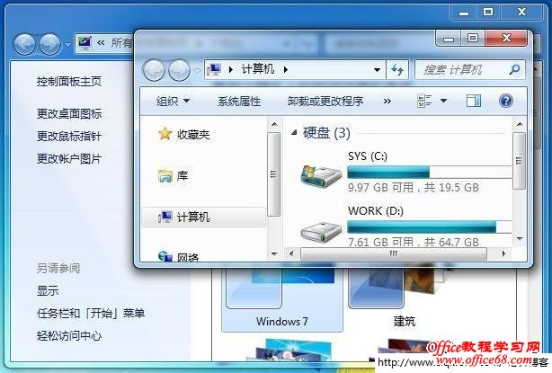 三、Aero桌面 Aero Desktop是鲍尔默到处宣讲的Windows 7法宝,Aero桌面说到底就是个若隐若现、朦朦胧胧的半透明效果。 Windows XP到是很干净,默认是个简单的蓝色主题(还是Windows经典更快一点),整体设计上也是非常简洁高效,这一点正是Windows XP在全世界取得傲人业绩的核心。但是如果是第一安装Windows 7,默认设置下让Windows 7给你的计算机打个分,结果肯定让你大跌眼镜。不是你的内存太低就是显卡太差。 不过微软不这么做也不行啊,否则硬件厂家和OEM厂家都不会答应,总得整点耗资源的东西,才能让用户买硬件,于是Aero出来了,硬盘搜索出来了,各种保护模式、权限管理出来了,于是又把大家好不容易跟上时代的计算机甩的远远的。