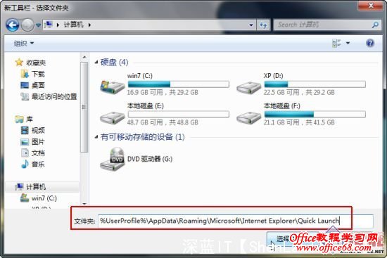 从Vista起,日常操作中就会经常用到右键菜单的“以管理员身份运行”,老是用右键有时也不那么顺手,现在,按住Ctrl + Shift再启动程序就可以直接“以管理员身份运行”了。 Win + Space(空格) 将所有窗口透明化,仅保留边框,效果同鼠标悬停在“显示桌面”按钮上一样。 (3) Win+T 将任务栏第一个图标变为焦点,连续按可以在任务栏所有图标里循环,不论是否运行中。 找回QuickLaunchBar(快速启动栏) 从XP、Vista一路走来的朋友,对于快速启动栏一定非常看重 Win + T 将任务栏第一个图标变为焦点,连续按可以在任务栏所有图标里循环,不论是否运行中。 找回Quick Launch Bar(快速启动栏) 从XP、Vista一路走来的朋友,对于快速启动栏一定非常看重,作为应用程序启动文件和文件夹的集中地,它帮我们节省了不少时间。进入Windows7后,随着超级任务栏的出现,以前的快速启动栏被移除了,这让用惯了快速启动栏的朋友感到很不习惯。尽管全新的超级任务栏也具备了快速启动栏的功能,可是有些人还是想找回这个快速启动栏。 OK,没问题,我们可以通过其它方式让快速启动栏回归。任务栏空白处右键,选择“工具栏”——“新建工具栏”,然后在下方的框里输入以下路径: %UserProfile%\AppData\Roaming\Microsoft\Internet Explorer\Quick Launch(请用半角状态替换文中全角\)