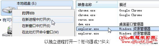 不知道各位在日常操作中,有没有遇到过Explorer(资源管理器)崩溃的情景。因为Explorer通常以单一进程形式运行,一旦发生崩溃会让人很恼火,因为包括桌面等在内都会受到影响。Windows7里提供了一个改善方法,允许多个Explorer进程。提醒大家打开资源管理器后,按住Shift,然后在任意分区或者文件夹上右键,选择“在新进程中打开”即可。此时启动任务管理器,你就会发现运行了2个Explorer进程,这样即使因为某些原因导致其中一个崩溃,对整个系统的影响也很小。