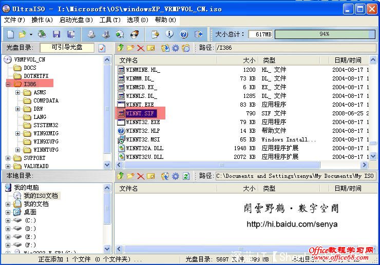 图二十八 使用UltroISO编辑Windows XP安装ISO文件,把WINNT.SIF添加到i386文件夹内