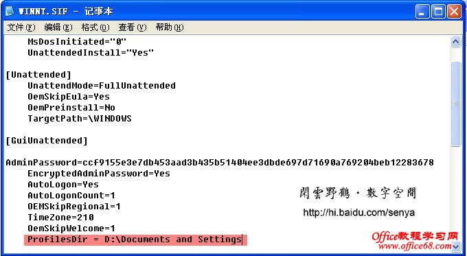 还可能利用该应答文件,把Documents and Settings内的文件夹与文件转移到其它分区内,用记事本修改应答文件,在[GuiUnattended]内添加一项配置:ProfilesDir = D:Documents and Settings