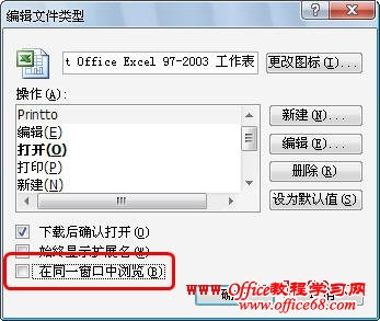 当我们用IE浏览器在网页中点击某个Excel工作簿的下载链接时,通常会弹出一个“文件下载”对话框,在对话框中如果单击“打开”按钮,对于安装了Excel 2003的XP系统,就会直接在IE浏览器中打开这个工作簿文件,而不是用Excel程序本身来打开。与此相反的是,如果系统中安装了Excel 2007,默认会在Excel程序中打开工作簿,而不会在IE浏览器中打开。我们可以根据不同的需要,在Windows XP中设置是否用IE浏览器来打开网页中的Excel工作簿文件,方法如下: 1.打开“我的电脑”,依次单击菜单“工具→文件夹选项”,弹出“文件夹选项”对话框。 2.在“文件夹选项”对话框中,选择“文件类型”选项卡,在“已注册的文件类型”的“扩展名”列中找到并选择相应的文件扩展名。如下图中选择的是“XLS”文件,表示要对“XLS”文件类型进行设置。单击“高级”按钮。 3.弹出“编辑文件类型”对话框。确定是否在IE浏览器中打开所选文件类型文件的选项是“在同一窗口中浏览”选项。如果取消选择“在同一窗口中浏览”选项,点击IE中的“XLS”扩展名的工作簿文件就不会在IE浏览器窗口中打开了,否则就会用IE浏览器打开工作簿文件。 最后单击“确定”按钮完成设置。 另外,有时我们在网页中点击某个工作簿链接时,如果没有弹出“文件下载”对话框,而是直接被IE或Excel程序打开了,这是因为上述对话框中的“下载后确认打开”选项没有选中。选择该选项后下载该扩展名的文件时就会弹出“文件下载”对话框。 |