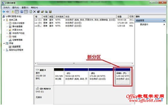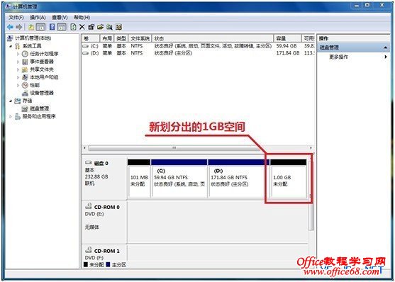 5. 之后我们可以看到在D盘右边多了一块区域,这就是我们刚才分出来的那1G空间。就好比一块空地只有盖了楼大家才能住进去一样,这1G的空间并不能直接使用,需要建立成磁盘卷以后才能使用。