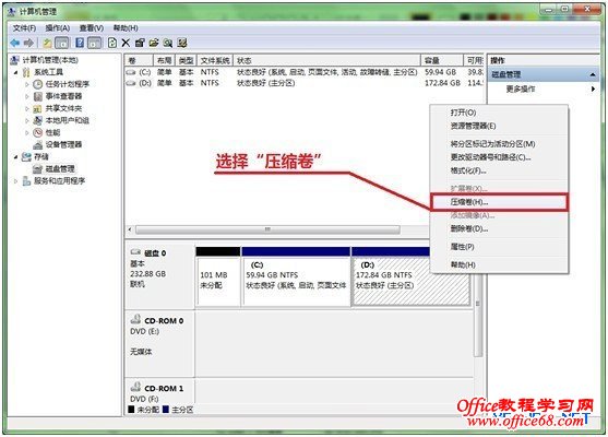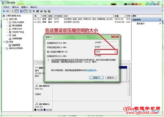 3. 下面我们以D盘为例,介绍一下怎样分区以及合并分区。点选D盘的那个方块区域然后右击,会出现一个菜单,选择“压缩卷”。系统会计算可压缩的空间,稍等片刻会出现一个空间分配的界面。我们要做的就是在第三栏输入需要压缩的空间大小(单位是MB),比如我想分出1G的空间,那么我输入1024,然后点击“压缩”就好了。