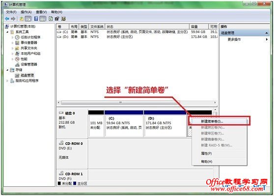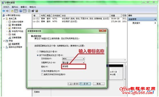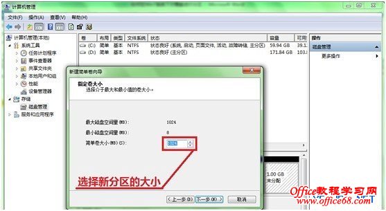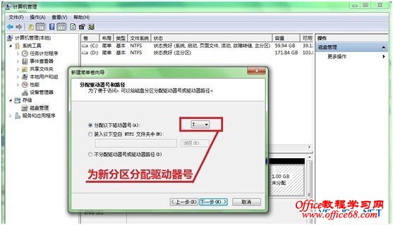 7. 下一步就是建立新的磁盘卷,右击新划分出来的区域,选择“新建简单卷”会进入“新建简单卷向导”,首先要选择新建分区的大小,这里我选择将刚才压缩出的空间全部划分为一个分区,也就是1024。然后按“下一步”,会让我们选择新建卷的驱动器号,选择“T”好了。继续“下一步”,在这里可以选填卷标,就在“示例1”的地方,比如新分区用来存放音乐,可以填“音乐”,不填的话也没有影响,其他的设置默认就可以了。在完成这一系列操作以后,新的分区就建立好了!