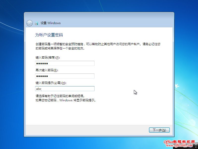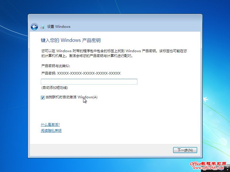 C、输入Windows 7的产品序列号25位,这个也可以暂时不输入,是否自动联网激活Windows选项也否,也没关系,可以在稍后进入系统之后进行激活也可以。点击下一步。