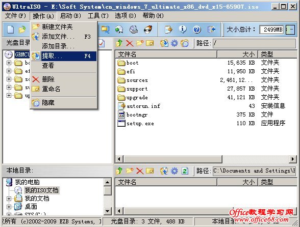 第四步:拷贝Windows 7的系统文件到安装目录根目录下,由于目前很多计算机相关的驱动都没有更新支持Windows 7,尤其很多老主板,所以特别推荐把Windows 7整体全部系统文件都拷贝的安装目录下,根据实际测试结果,Windows 7对目前市面流行的主板、显卡、声卡等基本硬件都是支持的很好,在安装过程会自动识别并安装Windows 7自带的驱动程序。 提取方法如下: 1、点击菜单操作——提取: