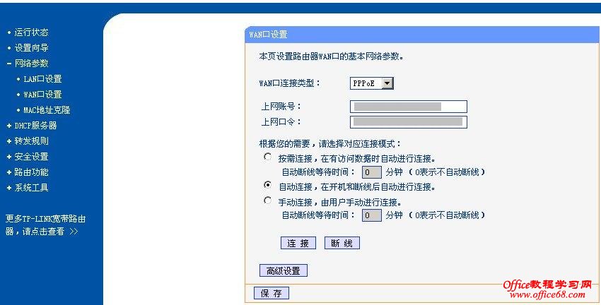 上图为TP-LINK R402的管理界面截图,大家可以在网络参数——WAN口设置里面,输入上网账号和口令密码(电信或网通为您安装时候留下给您的),底下选择自动连接,这样只要每次路由器和ADSLMODEM一上电就会自动控制ADSL登录网络,无需手动再次干预。其它路由器设置类似。