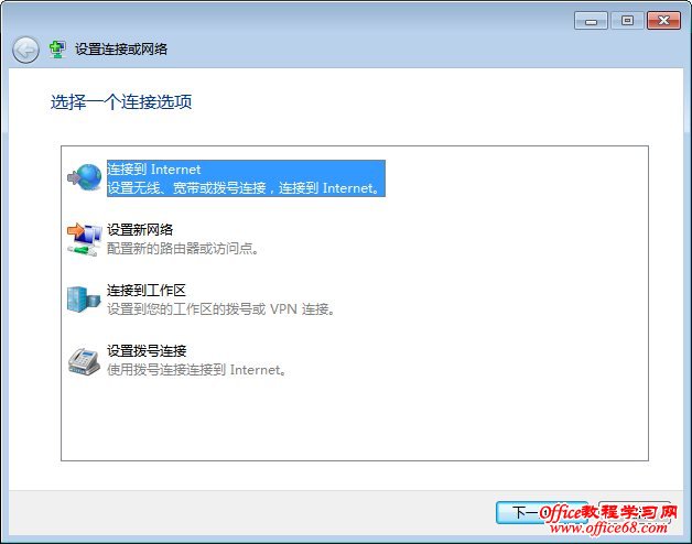 A、在图1中——更改网络设置——点击设置新的连接或网络。然后选择第一项“连接到Internet”(下图3)