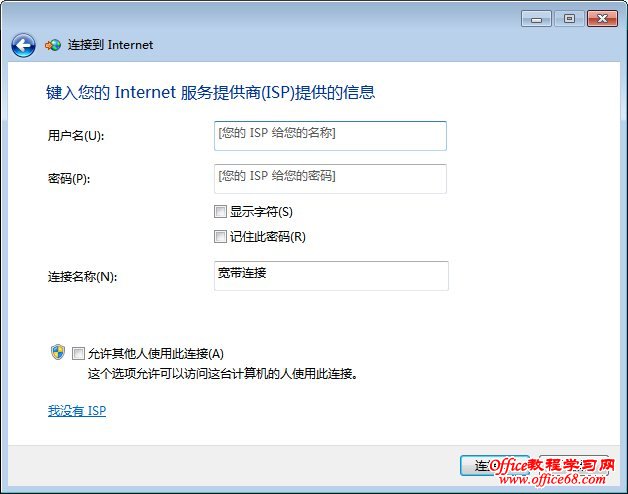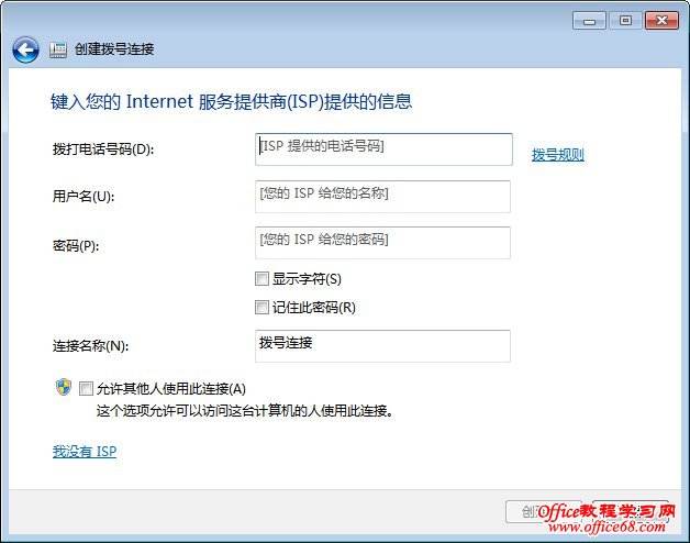 在上图输入您的电话号码、用户名和密码即可创建MODEM拨号连接了。