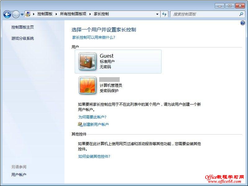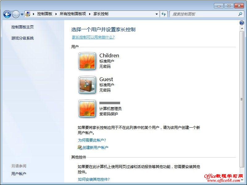 很多已有孩子的家长用户,在使用Windows 7的时候,可能会使用到Windows 7的家长控制系统,现在的网络上包括很多大型门户网站,基本到处花花绿绿的,太多不适合孩子了,国家一查再查效果也不明显,虽然现在已经有绿霸软件,但是天缘博客暂时并不推荐使用,毕竟绿霸的软件水准可能还需要市场考验一段时间。再者稍后必然出现的绿霸漏洞可能会让大家都很被动。所以还是推荐使用Windows 7系统自带的家长控制。 Windows 7的家长控制设置也很简单,首先您要使用管理员帐户登录Windows 7,然后参考以下步骤进行设置: 一、为Windows 7家长控制对象创建帐户,当然这个帐户是为我们的孩子使用的 打开控制面板——家长控制,点击中间的创建“创建新用户帐户”,下图1所示。