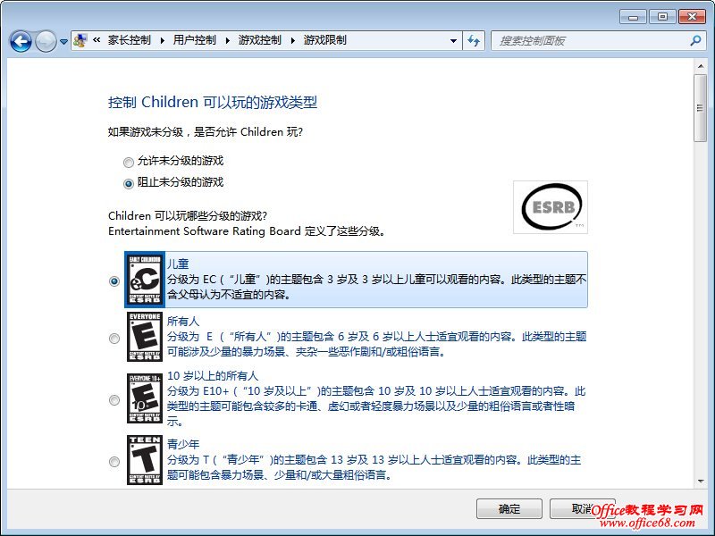 3、游戏分级设置设计,是否允许该用户玩游戏、按照分级和内容类型限制游戏访问、按名阻止或允许特定游戏三个部分,不给玩游戏一般是不可能的,孩子也不答应,对于Windows 7自带的游戏一般无需设置均可,主要还是限制EC分级游戏(正规的游戏上市都要进行分级审查并颁发许可的,一般从游戏网页或光盘包装说明上找到分级别),分级设置图5如下:
