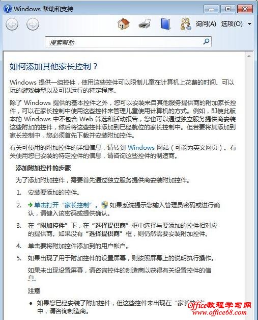 三、最后一项我们需要对孩子帐户进行网页,我们回头看一下图1的最下面有个其他控件一栏,这个栏目就是作为网页过滤和活动报告之用,但是需要安装一些控件才能使用。点击该链接会弹出Windows 7帮助,下图7所示: