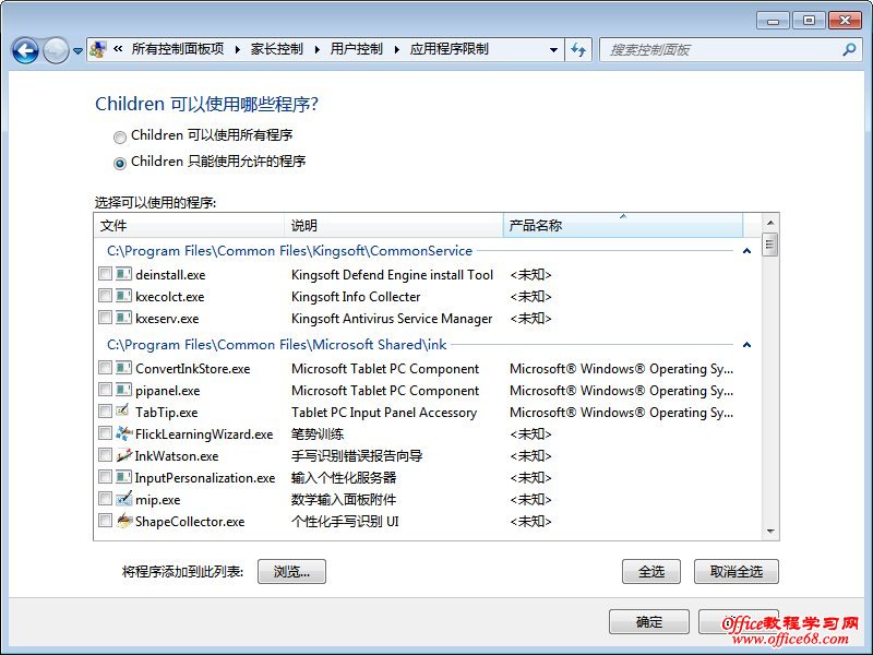 对于家长已经在机子上安装某些不适合孩子玩的游戏的时候,可以采用下面第四条的程序限制阻止孩子运行。 4、允许运行的程序设置如下,家长们只需要选定将要阻止的程序或自己安装的不适合孩子的游戏程序前面打钩并确定即可,下图6所示。