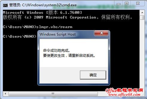 当系统试用期到了最后一天的时候,在系统控制面板中会提示必须激活。我们可以利用合法命令重新计数30天。打开命令提示符(在”运行“中输入”cmd”),输入“slmgr.vbs/rearm”。稍等几秒钟会弹出对话框提示命令完成,重启生效。