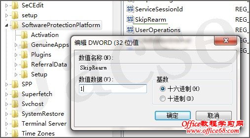 在“运行”中输入“regedit”,打开注册表窗口。定位到”HKEY_LOCAL_MACHINE\SOFTWARE\Microsoft\WindowsNT\CurrentVersion\SoftwareProtectionPlatform” 。找到右侧窗格中的“SkipRearm”,将其键值修改为“1”,然后可以再次使用“slmgr.vbs /rearm”重新计时30天激活系统,一共可以有效修改8次。