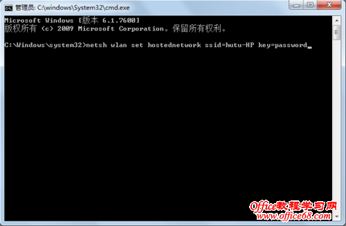 第二步,在cmd中输入“netsh wlan set hostednetwork ssid=计算机名 mode=allow key=设置密码。