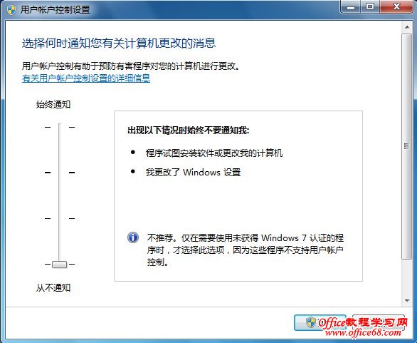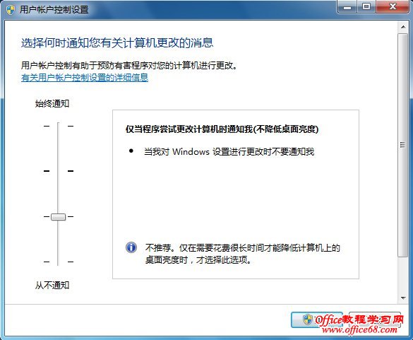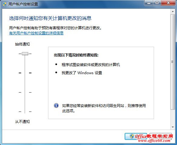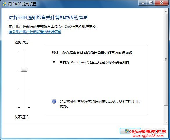 出现用户账户UAC控制设置窗口,如下图所示,UAC已经提供分级控制功能,总共有四个选项,分别是:始终通知、默认通知、程序修改通知和不通知。