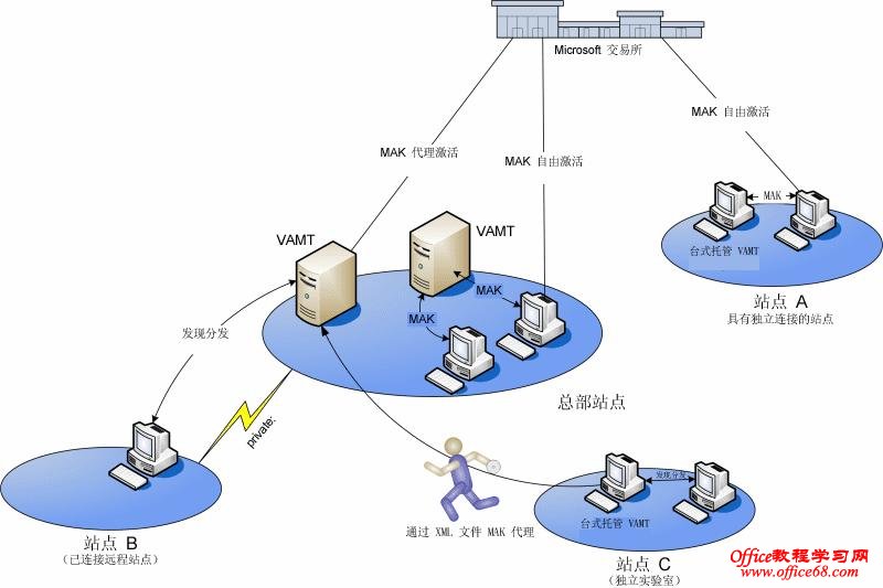 三、MAK激活 MAK是多用途产品激活密钥的简称,MAK不会自动激活Vista或Windows 7,默认情况下,在安装了MAK后计算机会尝试在线自动激活。如果计算机不具有稳定的Internet 连接,则必须通过在线连接到 Microsoft 的激活系统或通过电话来手动激活系统。使用 MAK 激活的系统会永久性地处于激活状态,除非对系统组件进行重大修改。 MAK的典型应用场景如下: