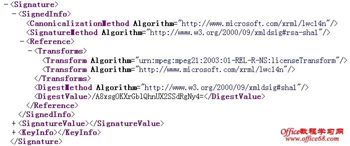 其中RSAKeyValue公钥是被Windows操作系统用来解密数字签名SignatureVaule,(跟DigestValue进行比较?),从而验证SignedInfo的正确性。