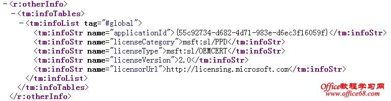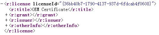 OEM激活Windows 7需要三个条件,即SLIC 2.1、OEM证书、OEM密钥,上一篇介绍过SLIC的组成结构,现在我们来看一下OEM证书到底品貌如何,这个xrm-ms文件里头到底装载哪些宝藏呢,本文就来浅析一下,跟SLIC一样,单凭经验或猜测很难完全明白这些东西的流程,否则微软要要让OEM厂商更换证书版本了。 OEM证书虽然扩展名是XRM-MS,实际格式是XML的,所以查看页很简单,只需要拉到浏览器窗口即可看到证书的全部内容。XML没什么好介绍的,只是一种文件格式而已,编程访问XML也非常方便,一般也可以作为小型数据库使用,本文我们只关心这个文件有用内容,即XML的字段信息,确切的讲,本文的某些解释肯定是有问题的,只能作为研究参考用途,当然,猜的人多了,结果也就出来了*_*。 本文的示例就以联想的OEM证书为例,文件为LENOVO.XRM-MS,为了方便理解,天缘特别分段抓图说明。 OEM证书的主体分四个部分:证书标题部分(title)、授权部分(grant)、发布商部分(issuer)和其他信息部分(otherInfo)。 一、证书标题部分