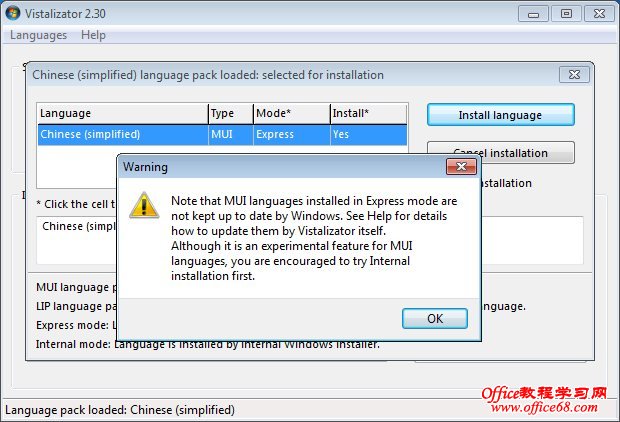 D、语言包装载完成后,如下图,会提示Express模式安装警告,因为在扩展安装模式下安装语言包可能会影响到Windows更新,所以建议你优先尝试内部安装模式interanl installation mode,点击确定。
