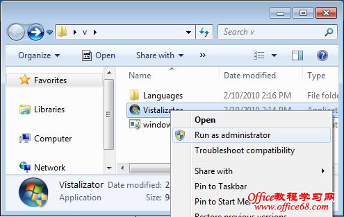 A、下载完Vistalizator和语言包之后,然后在管理员权限下执行,如下图(鼠标右键选择Run as administrator)。