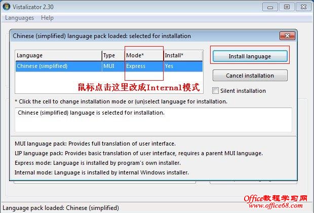 扩展安装模式执行的是通过快速清理方法安装新语言,不能更新全部的windows系统日志,所以该方法可能会导致Windows在更新某些补丁时无法识别语言。这些Windows更新不得不使用Vistalizator进行手动更新。相比内部安装模式,安装时间更短一些,而且可以放心使用,除非你升级到语言到SP1,否则安装过程不会覆盖任何文件。如果使用内部安装模式感觉有问题,可以使用扩展安装模式。