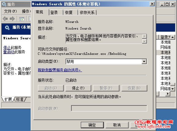 9、总是从内存卸载无用的动态链接库 这个功能可以自动释放一些内存空间,设置方法运行注册表编辑器regedit,依次点开HKEY_LOCAL_MACHINE\SOFTWARE\Microsoft\Windows\CurrentVersion\Explorer\AlwaysUnloadDLL,把其中的AlwaysUnloadDLL设置为1即可。 10、禁止Windows 7崩溃时自动重启 这个功能用在服务器上还可以,个人电脑最好关闭,一方面可以定位问题,如果是正在工作,也不排除采用其他挽救可能丢失的资料或文件。设置方法:HKEY_LOCAL_MACHINE\SYSTEM\CurrentControlSet\Control\CrashControl,将其中的AutoReboot设置为1即可。 11、禁用Windows 7的搜索功能 在开始运行里输入services.msc并回车,在服务里找到Windows Search一向,双击,停止,禁止即可,如下图: