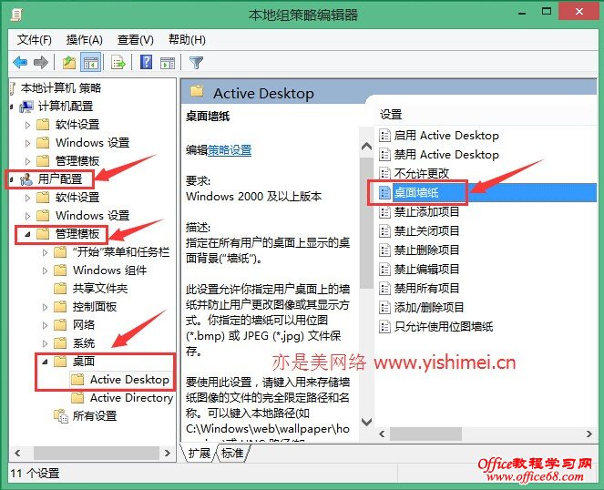 1、按下win+R打开运行,输入gpedit.msc回车后打开组策略,依次找到“本地计算机策略 - 用户配置 - 管理模板 - 桌面 - Active Desktop”,在右边找到“桌面墙纸”双击打开,选择“未配置”或“已禁用”,确定。