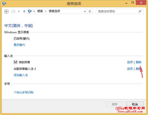 2、如果不打算使用Windows 8自带输入法,卸载也可以(控制面板 > 时钟、语言和区域 > 更换输入法),或安装使用第三方输入法也可以。