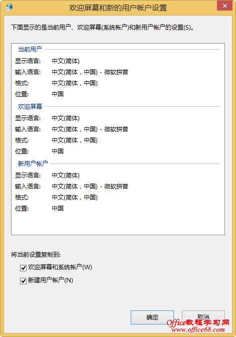 在如下确认修改窗口中,注意选中“欢迎屏幕和系统账户”和“新建用户账户”两个选项: