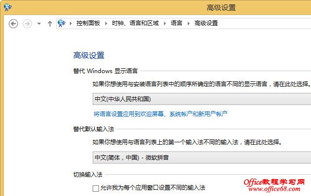 点击Log off now,然后再次登录进Windows 8即可看到中文界面。但是欢迎屏幕以及新用户等位置还是英文界面,可继续修改设置。 2、修改欢迎屏幕为中文界面再次到相同位置(语言 > 高级设置),点击第一个列表框下面的”将语言设置应用到欢迎屏幕、系统账户和新用户账户“: