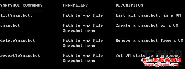 从上可以看出,这些命令参数可以完成开启或者关闭虚拟机等操作~ 比如关机命令可以使用:vmrun start "D:Windows7Win7.vmx"来启动虚拟机,其中start后面的是要启动的虚拟机系统的配置文件的位置 其他的几个类似,故不再赘述 2、SNAPSHOT COMMANDS 如下图: