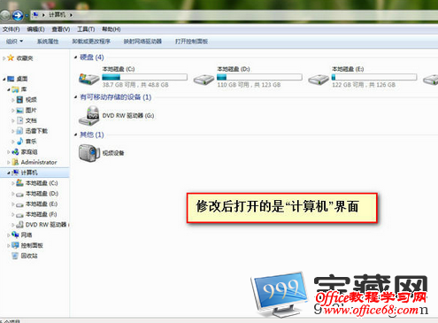 3. 在最后的路径上增加一个符号“,” 再次点击打开资源管理器发现就是熟悉的磁盘管理界面了。这样,你每次点击快捷键就可以看到习惯的我的电脑磁盘了,是不是很简单呢,赶紧动手修改吧。