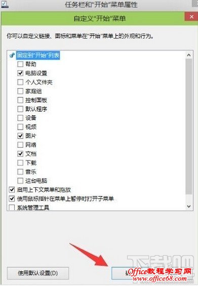 3:找到相应的程序固定到开始列表中去。选择好以后点击"确定",如果觉得添的没有什么用则可以点击"使用默认设置"