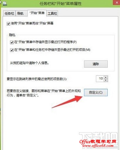 2:进入任务栏和开始菜单属性的界面中点击"开始菜单"在这下在就可以看到自定义开始菜单的按钮。点击"自定义"。