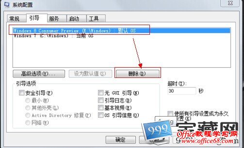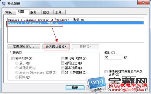 3、在弹出的对话框里面选择win7的引导项,设置为默认