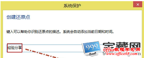 6、给还原点输入一个描述,如“经验分享”,然后单击“创建”。