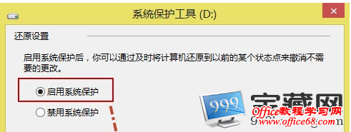 4、打开“还原设置”对话框,选择“启用系统保护”,然后单击“确定”。
