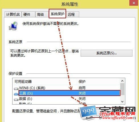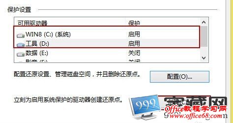 3、现在为C盘和D盘创建还原点。“系统保护”选项卡下的“保护设置”,发现C盘“保护”启用,而D盘“保护”关闭,这时候选中D盘,然后单击“配置”。