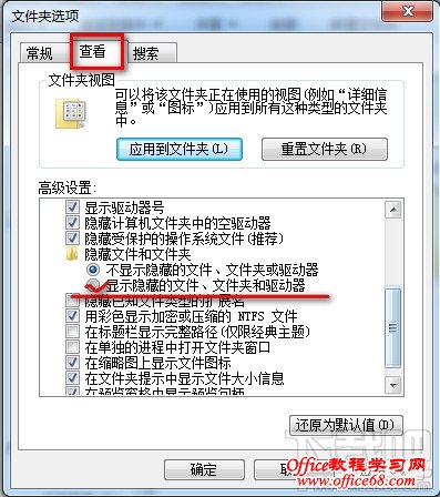 2:“查看”-“高级设置”-“显示隐藏的文件...”,点击应用,再点击确定
