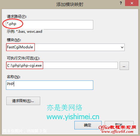 “请求路径”处填写*.php,“模块”选择FastCgiMoudle,“可执行文件”选择“C:\php\php-cgi.exe”,“名称”处填写PHP然后点击“确定”。